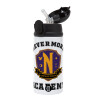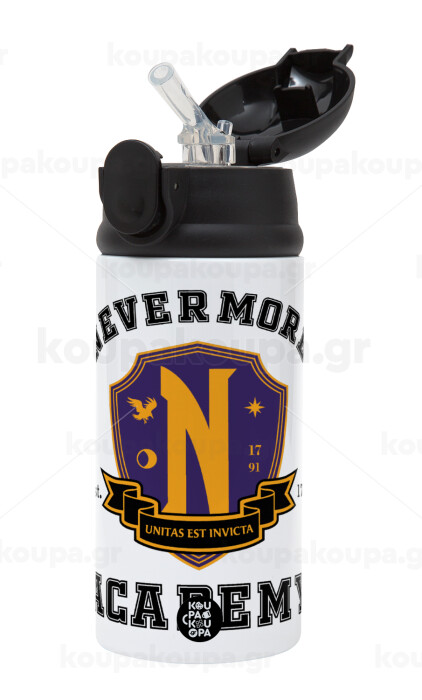 Wednesday Nevermore Academy University, Children's hot water bottle, stainless steel, with safety straw, Black (360ml) BPA-FREE