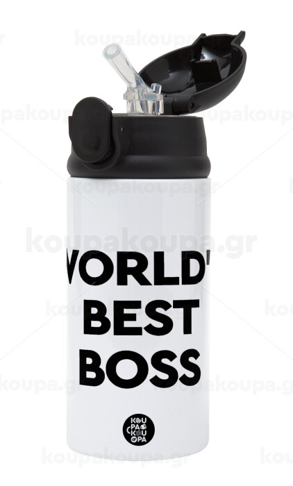 World's best boss, Children's hot water bottle, stainless steel, with safety straw, Black (360ml) BPA-FREE