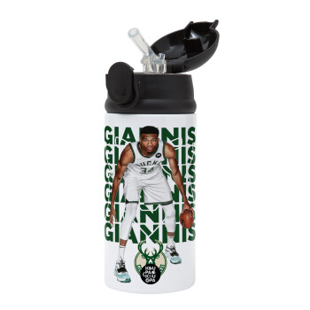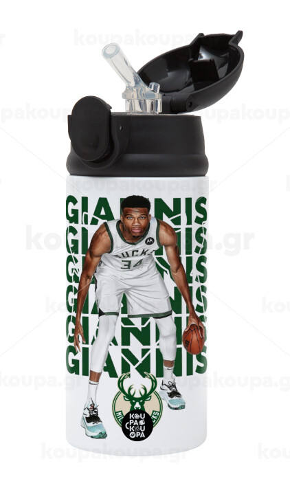 Giannis Antetokounmpo, Children's hot water bottle, stainless steel, with safety straw, Black (360ml) BPA-FREE