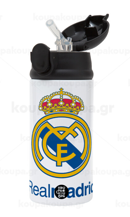 Real Madrid CF, Children's hot water bottle, stainless steel, with safety straw, Black (360ml) BPA-FREE