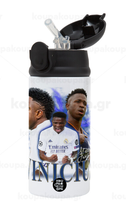 Vinicius Junior, Children's hot water bottle, stainless steel, with safety straw, Black (360ml) BPA-FREE