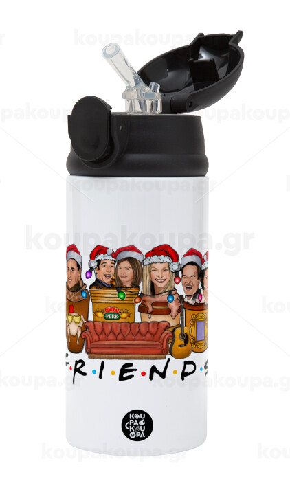 FRIENDS xmas, Children's hot water bottle, stainless steel, with safety straw, Black (360ml) BPA-FREE