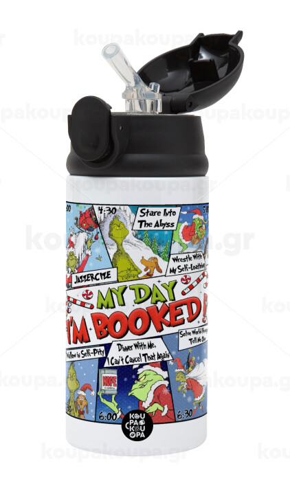 My Day Grinch, Children's hot water bottle, stainless steel, with safety straw, Black (360ml) BPA-FREE