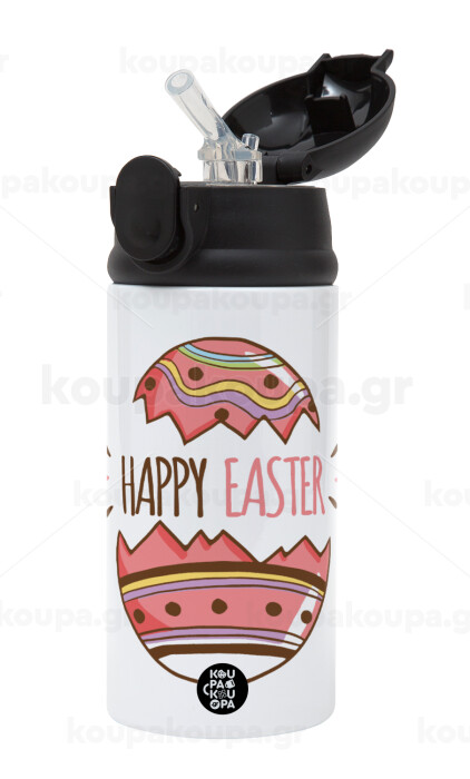 Happy easter egg, Children's hot water bottle, stainless steel, with safety straw, Black (360ml) BPA-FREE