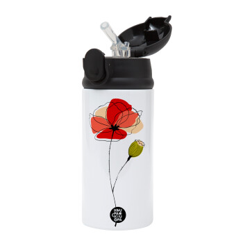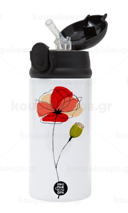 Red poppy flowers papaver, Children's hot water bottle, stainless steel, with safety straw, Black (360ml) BPA-FREE