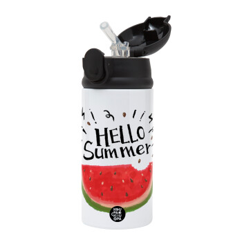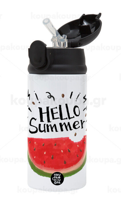 Summer Watermelon, Children's hot water bottle, stainless steel, with safety straw, Black (360ml) BPA-FREE
