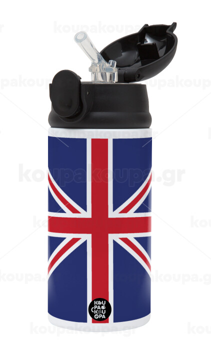 UK Flag, Children's hot water bottle, stainless steel, with safety straw, Black (360ml) BPA-FREE