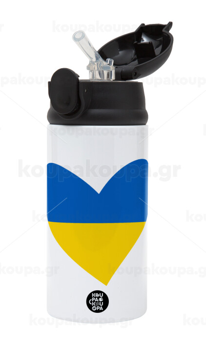 UKRAINE heart, Children's hot water bottle, stainless steel, with safety straw, Black (360ml) BPA-FREE
