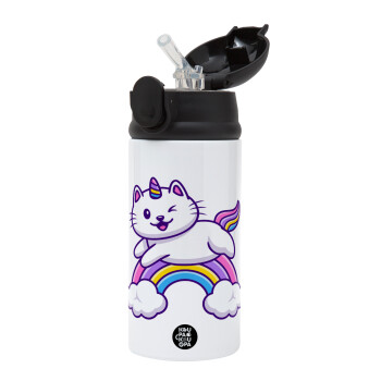 Cute cat unicorn, Children's hot water bottle, stainless steel, with safety straw, Black (360ml) BPA-FREE