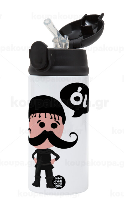Κρητικός "Οι", Children's hot water bottle, stainless steel, with safety straw, Black (360ml) BPA-FREE