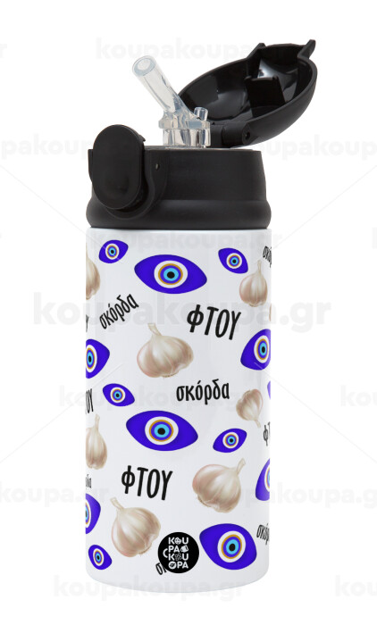 Φτου, φτου, σκόρδα!!!, Children's hot water bottle, stainless steel, with safety straw, Black (360ml) BPA-FREE