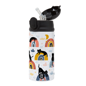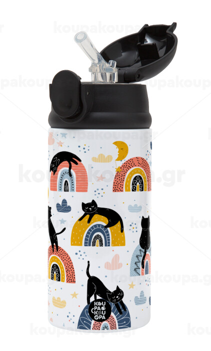 Γατούλες, Children's hot water bottle, stainless steel, with safety straw, Black (360ml) BPA-FREE