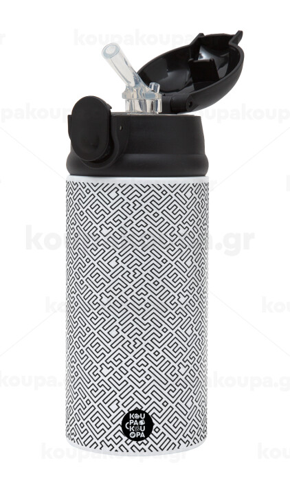 Doodle Maze, Children's hot water bottle, stainless steel, with safety straw, Black (360ml) BPA-FREE