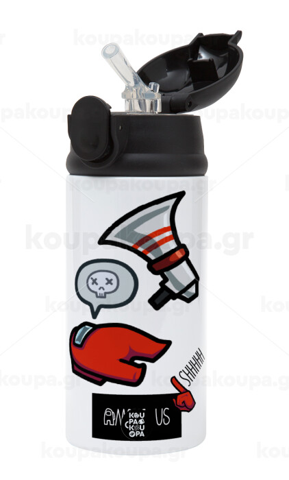 Among US Shhhh!!!, Children's hot water bottle, stainless steel, with safety straw, Black (360ml) BPA-FREE