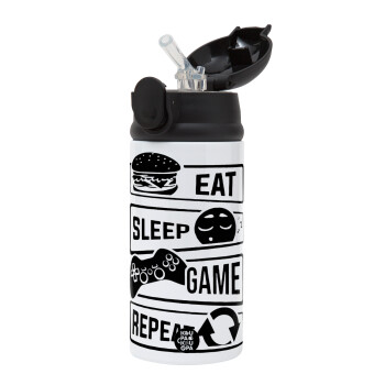 Eat Sleep Game Repeat, Children's hot water bottle, stainless steel, with safety straw, Black (360ml) BPA-FREE
