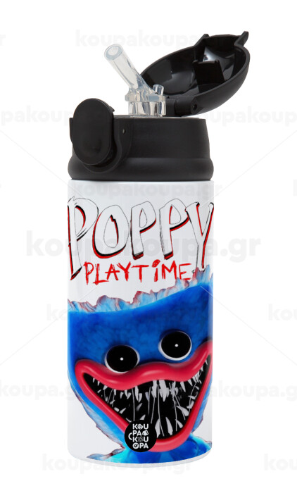 Poppy Playtime Huggy wuggy, Children's hot water bottle, stainless steel, with safety straw, Black (360ml) BPA-FREE