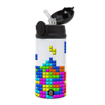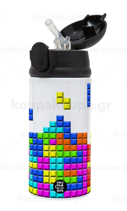 Tetris blocks, Children's hot water bottle, stainless steel, with safety straw, Black (360ml) BPA-FREE