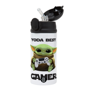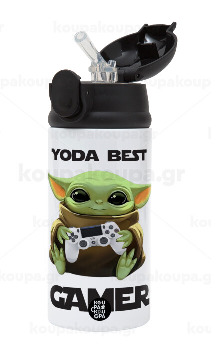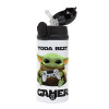 Yoda Best Gamer, Children's hot water bottle, stainless steel, with safety straw, Black (360ml) BPA-FREE