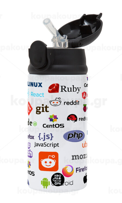 Tech logos, Children's hot water bottle, stainless steel, with safety straw, Black (360ml) BPA-FREE