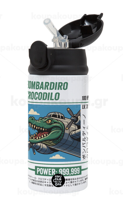 Bombardiro Crocodilo, Children's hot water bottle, stainless steel, with safety straw, Black (360ml) BPA-FREE