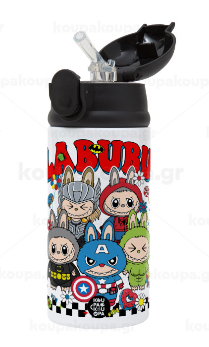 Labubu superheroes, Children's hot water bottle, stainless steel, with safety straw, Black (360ml) BPA-FREE