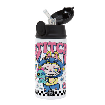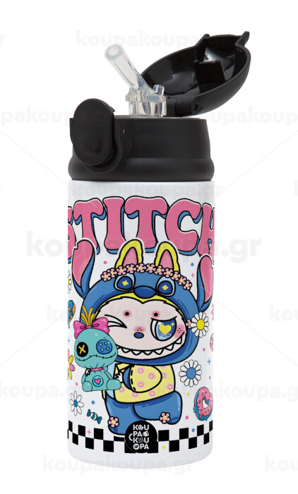 Labubu Stitch, Children's hot water bottle, stainless steel, with safety straw, Black (360ml) BPA-FREE