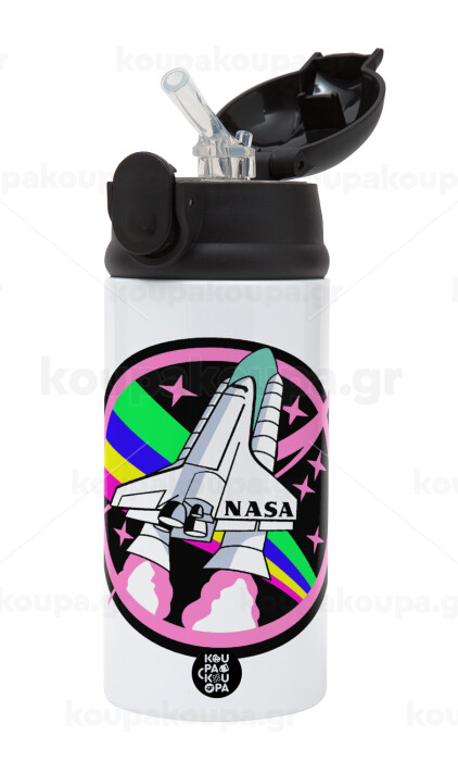 NASA pink, Children's hot water bottle, stainless steel, with safety straw, Black (360ml) BPA-FREE