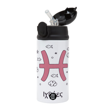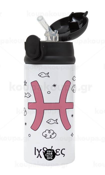 Ζώδια Ιχθύες, Children's hot water bottle, stainless steel, with safety straw, Black (360ml) BPA-FREE