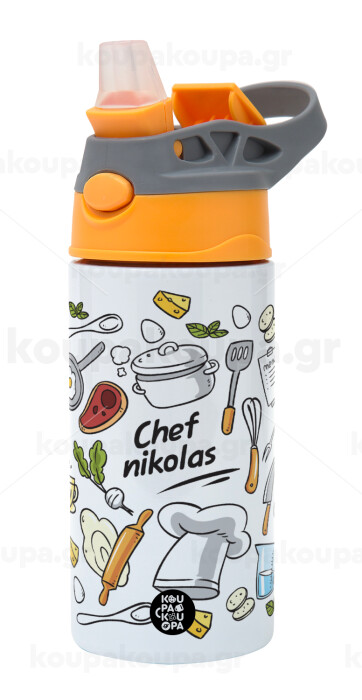 Chef με όνομα, Children's hot water bottle, stainless steel, with safety straw, Orange/Grey (360ml) BPA-FREE