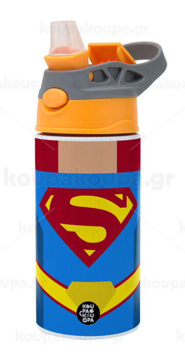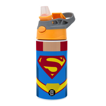 Superman flat, Children's hot water bottle, stainless steel, with safety straw, Orange/Grey (360ml) BPA-FREE