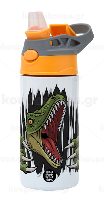 Dinosaur scratch, Children's hot water bottle, stainless steel, with safety straw, Orange/Grey (360ml) BPA-FREE