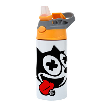 helix the cat, Children's hot water bottle, stainless steel, with safety straw, Orange/Grey (360ml) BPA-FREE