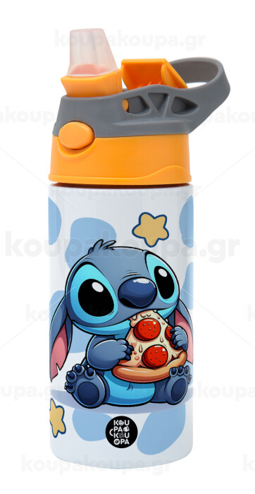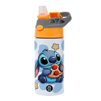 Stitch Pizza, Children's hot water bottle, stainless steel, with safety straw, Orange/Grey (360ml) BPA-FREE