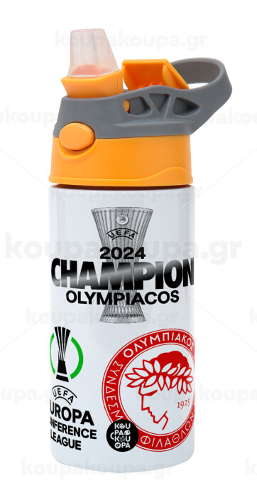 Olympiacos UEFA Europa Conference League Champion 2024, Children's hot water bottle, stainless steel, with safety straw, Orange/Grey (360ml) BPA-FREE