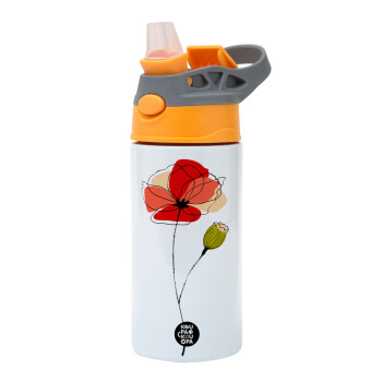 Red poppy flowers papaver, Children's hot water bottle, stainless steel, with safety straw, Orange/Grey (360ml) BPA-FREE