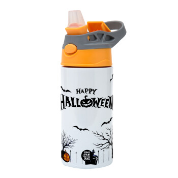 Happy Halloween cemetery, Children's hot water bottle, stainless steel, with safety straw, Orange/Grey (360ml) BPA-FREE
