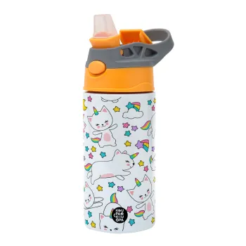 Cats unicorns, Children's hot water bottle, stainless steel, with safety straw, Orange/Grey (360ml) BPA-FREE