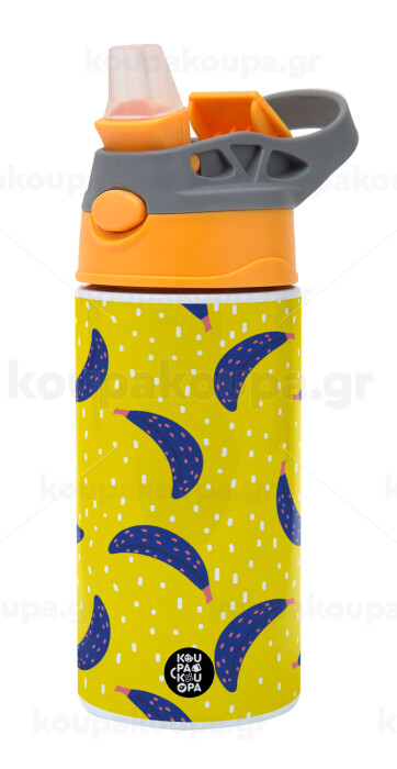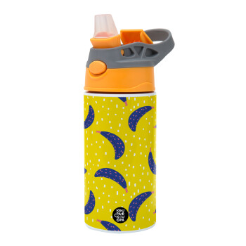 Yellow seamless with blue bananas, Children's hot water bottle, stainless steel, with safety straw, Orange/Grey (360ml) BPA-FREE