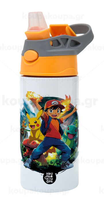 Ash Ketchum & Pikachu, Children's hot water bottle, stainless steel, with safety straw, Orange/Grey (360ml) BPA-FREE