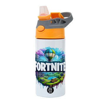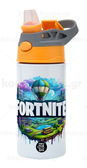 Fortnite land, Children's hot water bottle, stainless steel, with safety straw, Orange/Grey (360ml) BPA-FREE