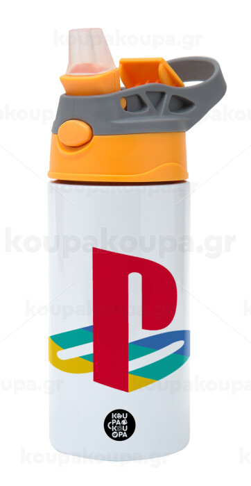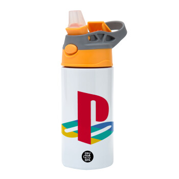 Playstation, Children's hot water bottle, stainless steel, with safety straw, Orange/Grey (360ml) BPA-FREE