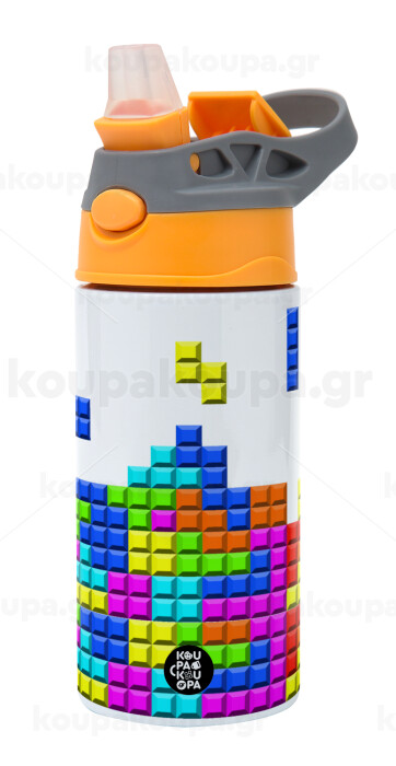Tetris blocks, Children's hot water bottle, stainless steel, with safety straw, Orange/Grey (360ml) BPA-FREE