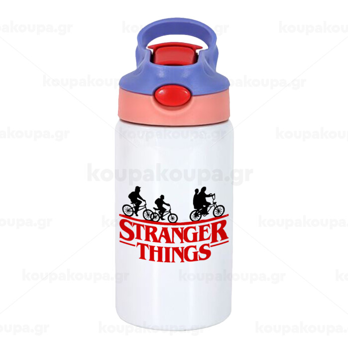Stranger Things red, Children's hot water bottle, stainless steel, with safety straw, pink/purple (350ml)