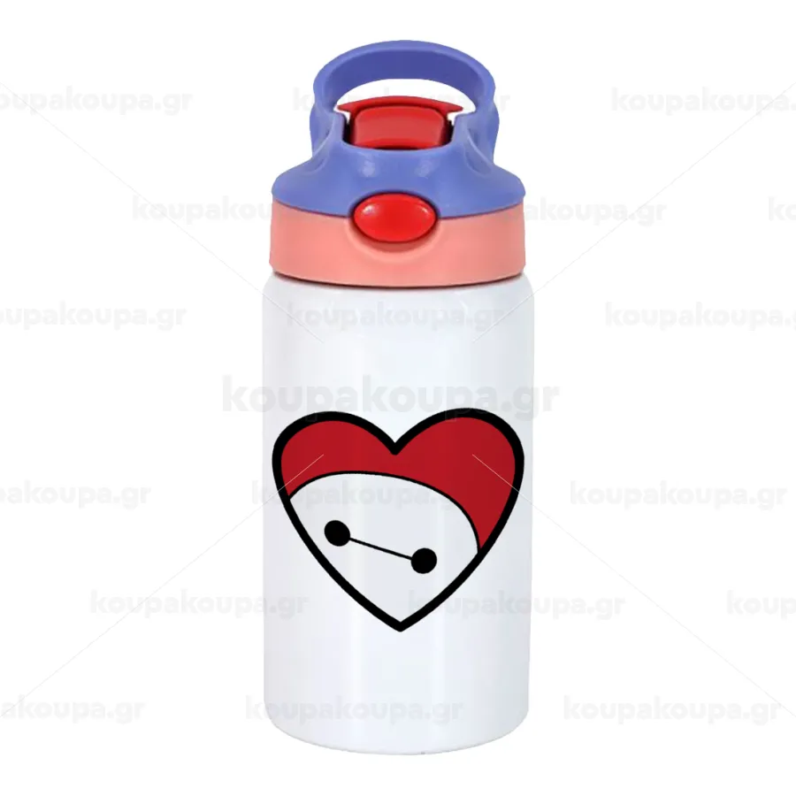 Baymax heart, Children's hot water bottle, stainless steel, with safety straw, pink/purple (350ml)
