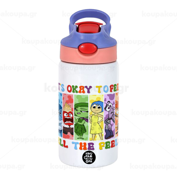 Inside Out It's Okay To Feel All The Feels , Children's hot water bottle, stainless steel, with safety straw, pink/purple (350ml)
