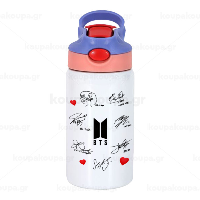 BTS signatures, Children's hot water bottle, stainless steel, with safety straw, pink/purple (350ml)