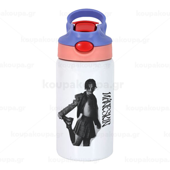 Maneskin Damiano David, Children's hot water bottle, stainless steel, with safety straw, pink/purple (350ml)