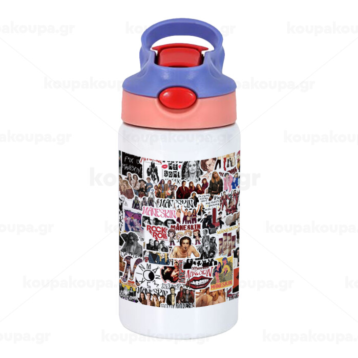Maneskin stickers, Children's hot water bottle, stainless steel, with safety straw, pink/purple (350ml)