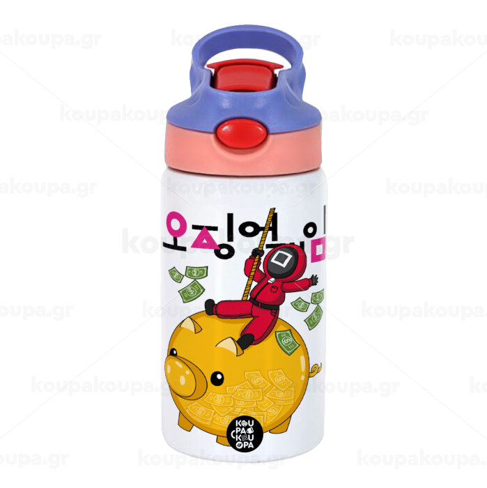 Squid game money pig, Children's hot water bottle, stainless steel, with safety straw, pink/purple (350ml)