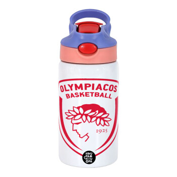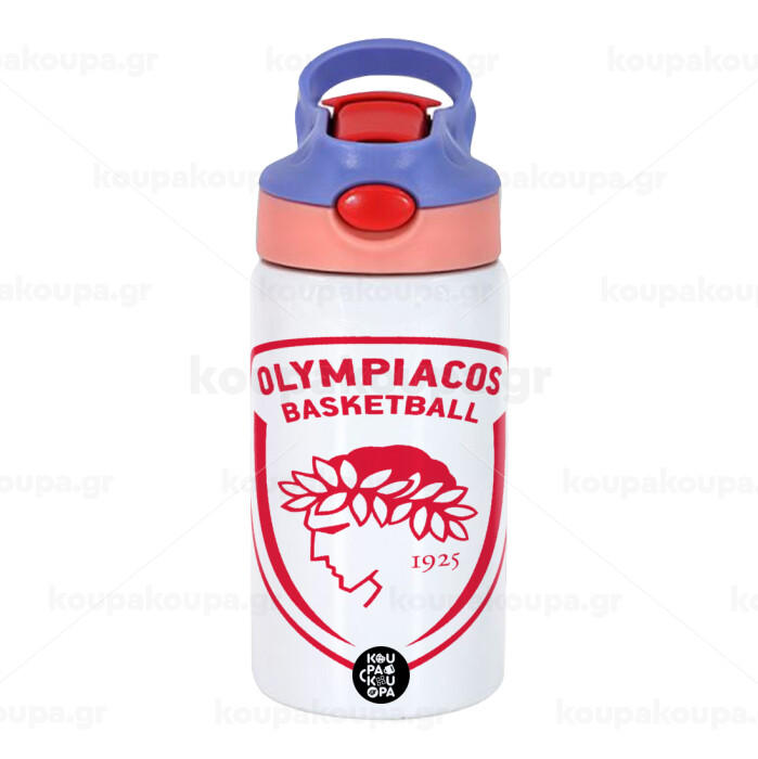 Olympiacos B.C., Children's hot water bottle, stainless steel, with safety straw, pink/purple (350ml)